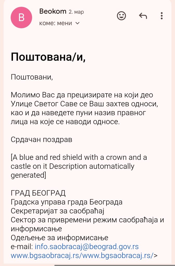Како наводе саговорници портала, обраћали су се на више адреса – путем електронске поште, кроз градске сервисе, преко портала и уз више ургенција. Ипак, конкретан одговор о правном основу за резервисање места није стигао ни после безмало два месеца.