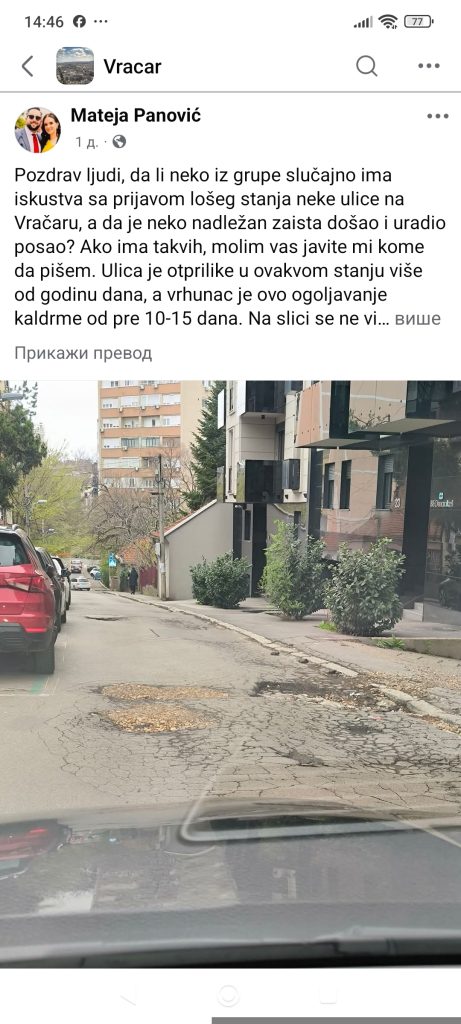 „Središnji deo ulice, kod pešačkog prelaza, ulegao je u dužini većoj od 5 metara. Vozila sa nižim klirensom praktično ne mogu da prođu, a da ne očešu pod automobila.“