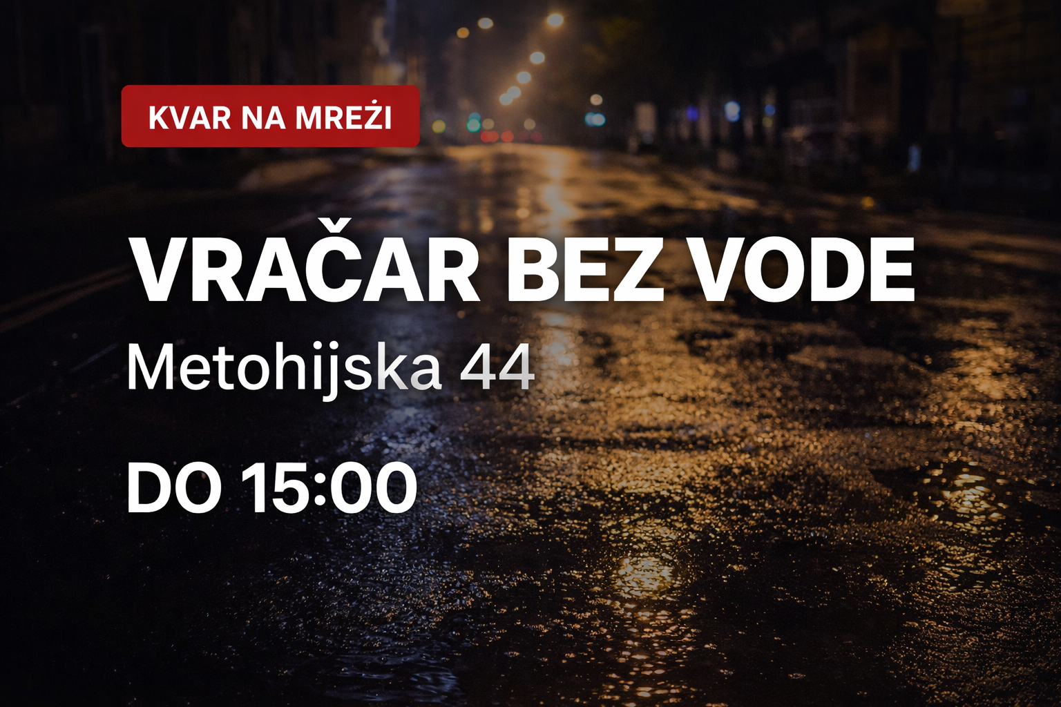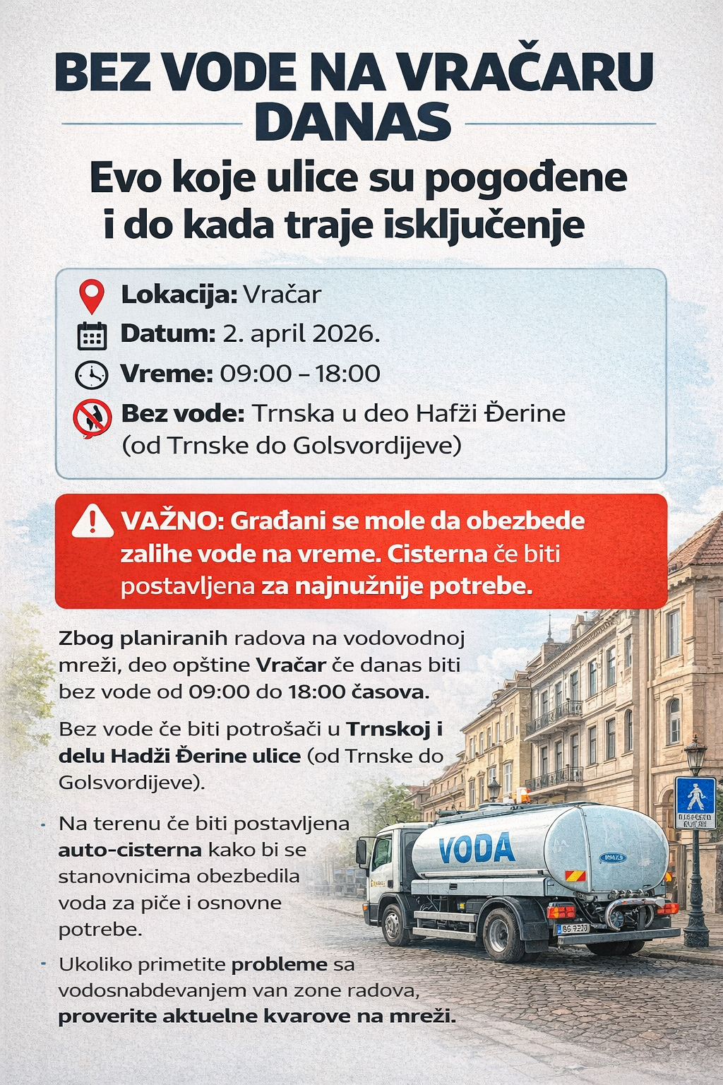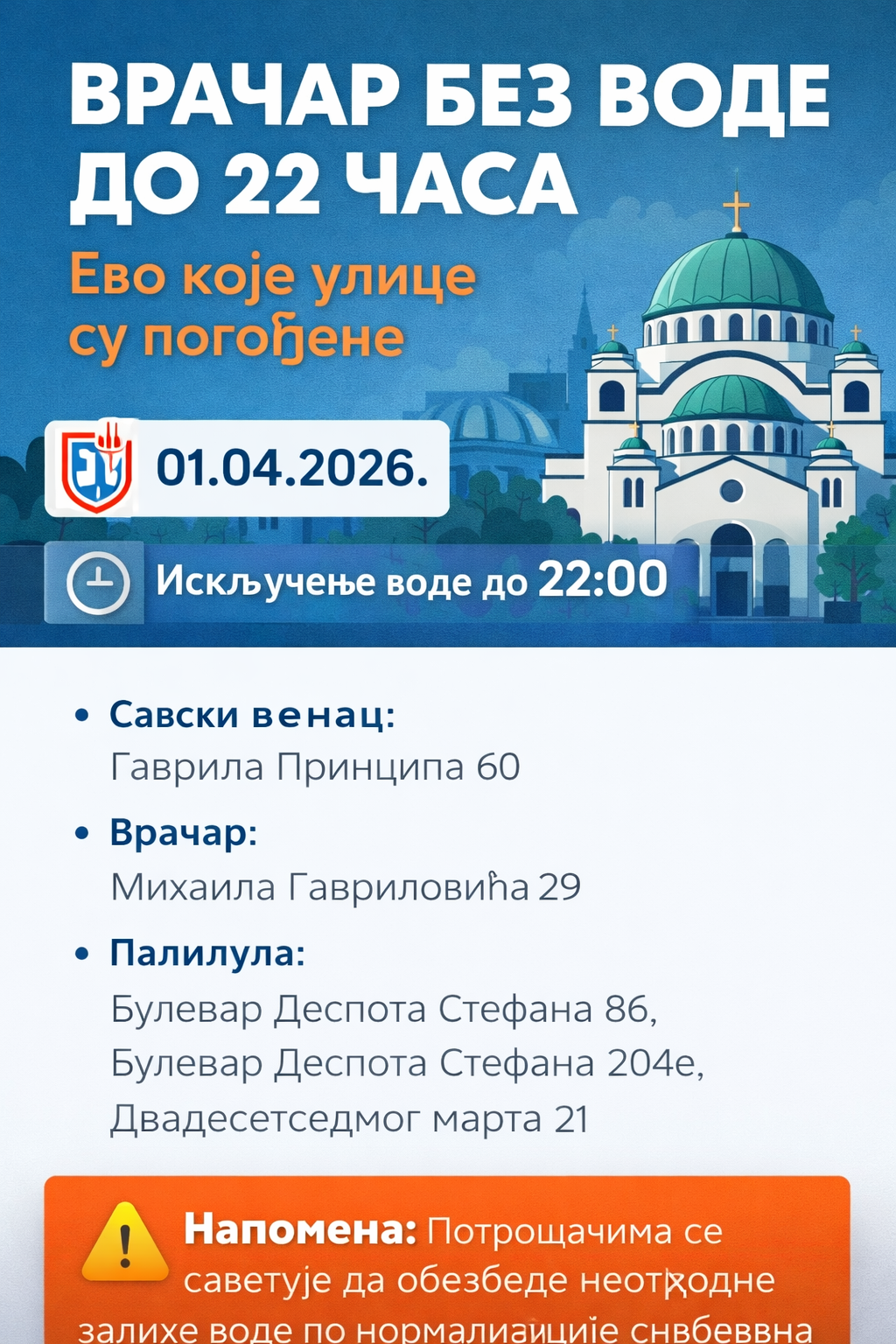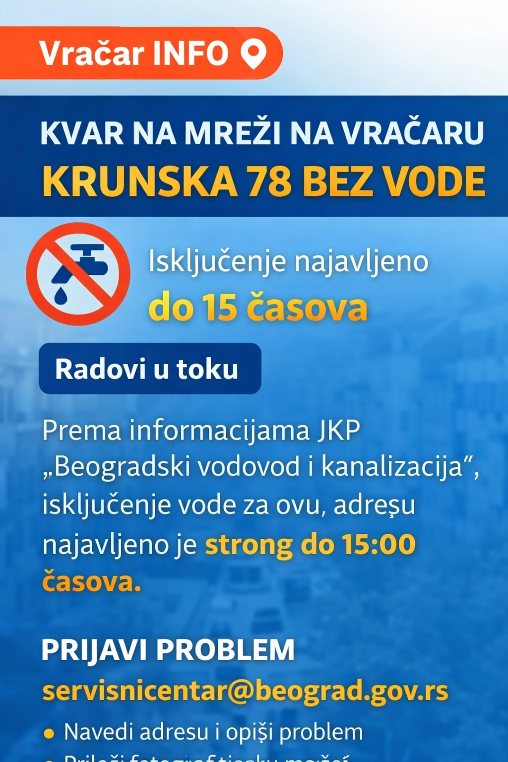 Потрошачи на Врачару данас су без воде због радова на водоводној мрежи. 📌 ИНФОДатум: 16.04.2026.Планирано искључење: до 15:00 часоваЛокација: Крунска 7 (Врачар) Како је саопштило ЈКП „Београдски водовод и канализација“, због квара на мрежи, без воде су потрошачи у делу Крунске улице на Врачару, као и у околним улицама. Нормализација водоснабдевања очекује се најкасније до … Read more